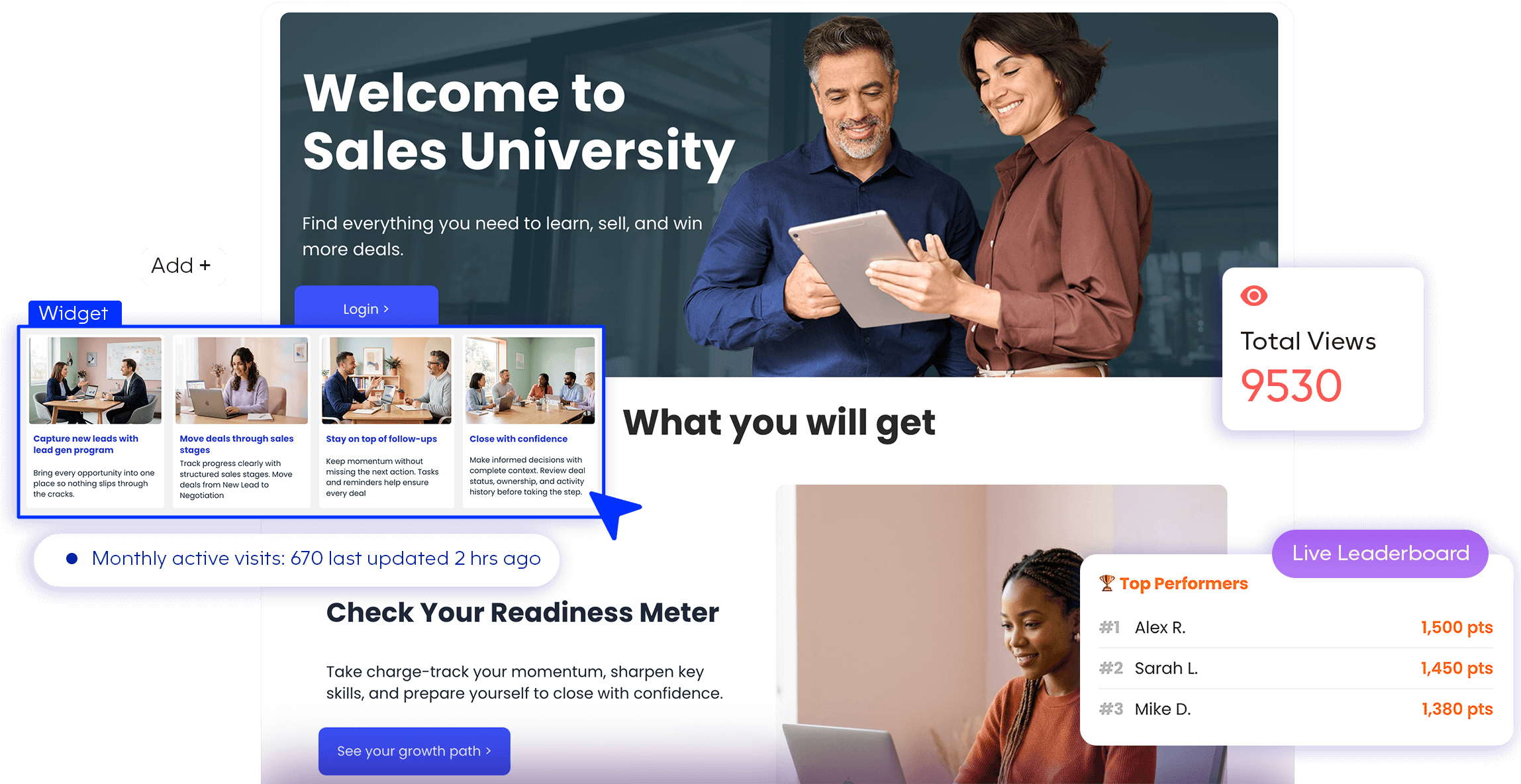 Stay on top of chats, activities, and deal status with a focused workspace. Embed live community engagement directly inside the learning flow.